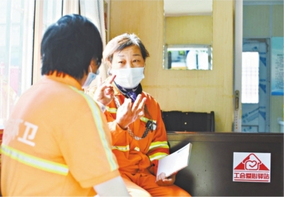 环卫工人在“爱心驿站”内休息聊天。